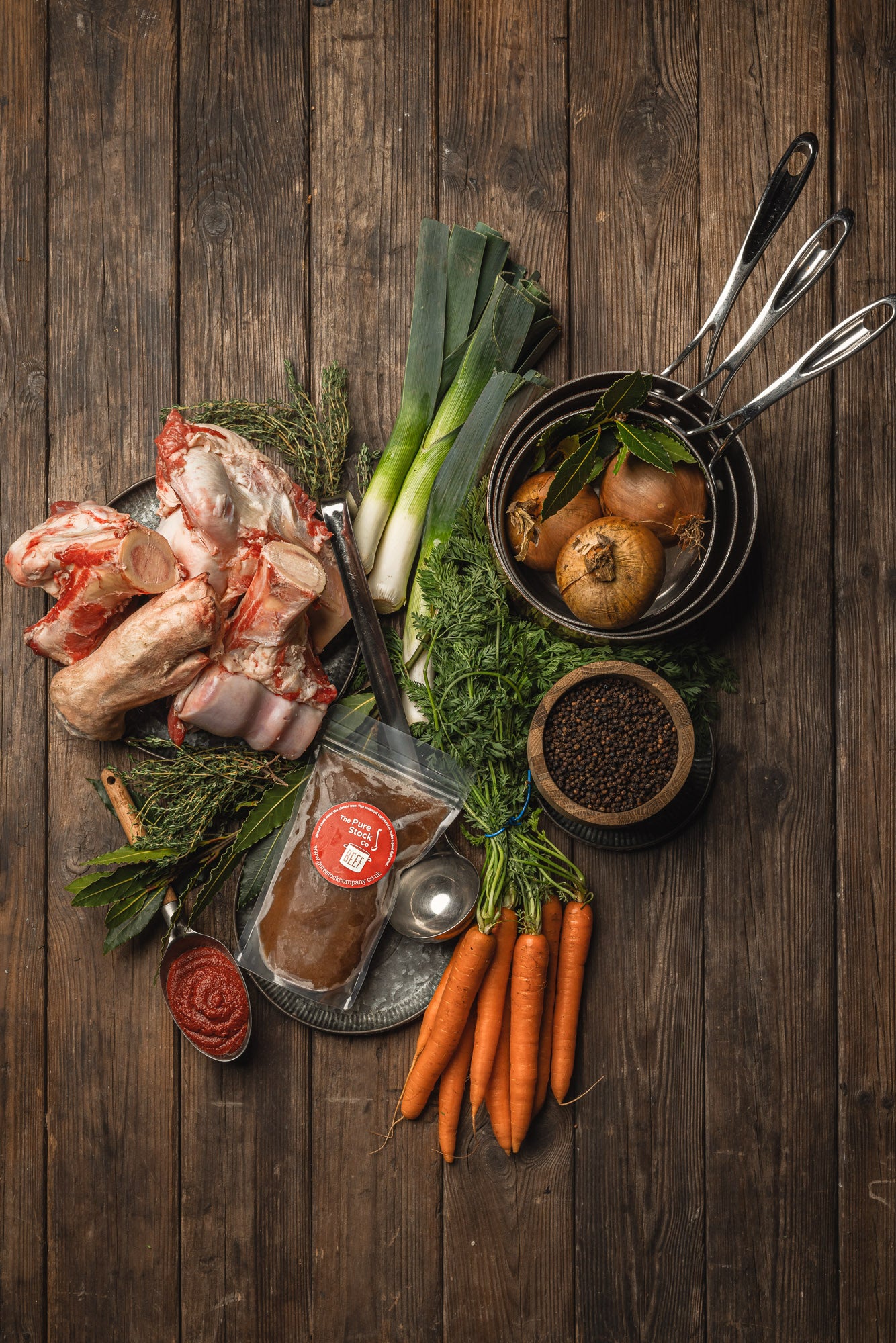 Ingredients: Spring Water, Grass-fed Beef Bones, Pig's Trotter, Onion, Leek, Carrot, Tomato puree, Bay Leaf, Thyme, Peppercorns