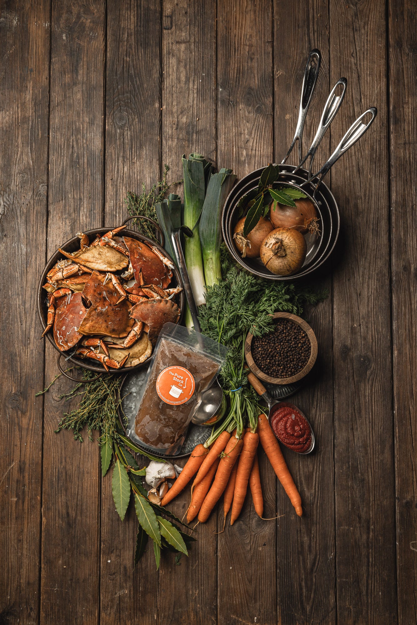 Ingredients: Spring Water, Shellfish (Crab shells), Onion, Leek, Carrot, Garlic, Tomato Puree, Thyme, Bay Leaf, Peppercorns